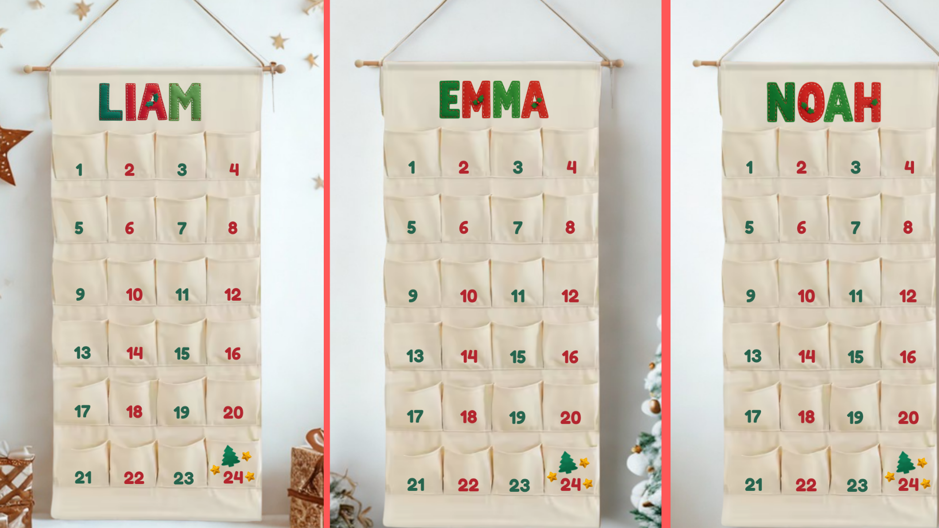 Un calendrier unique, décoré du prénom de votre choix en feutrine cousue à la main. Durable, solide et entièrement réutilisable chaque année, il devient une vraie tradition familiale pour patienter jusqu’au 25 décembre.